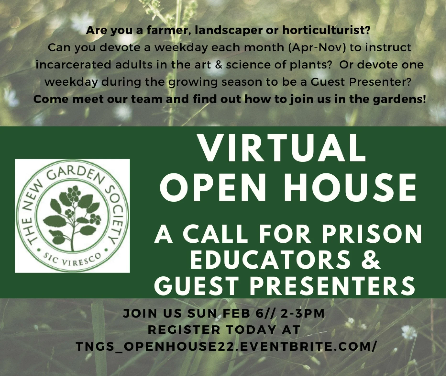 We are recruiting horticultural professionals in the Greater Boston area who are willing to devote at least one weekday a month to teach with us behind prison walls. Our virtual open house is a space for anyone curious about volunteering to find out more about prison garden roles and our team. We will be breaking down all the basics of what we do and who we are. Join us, virtually, Sunday, Feb 6, and learn how you can fit in with our work!